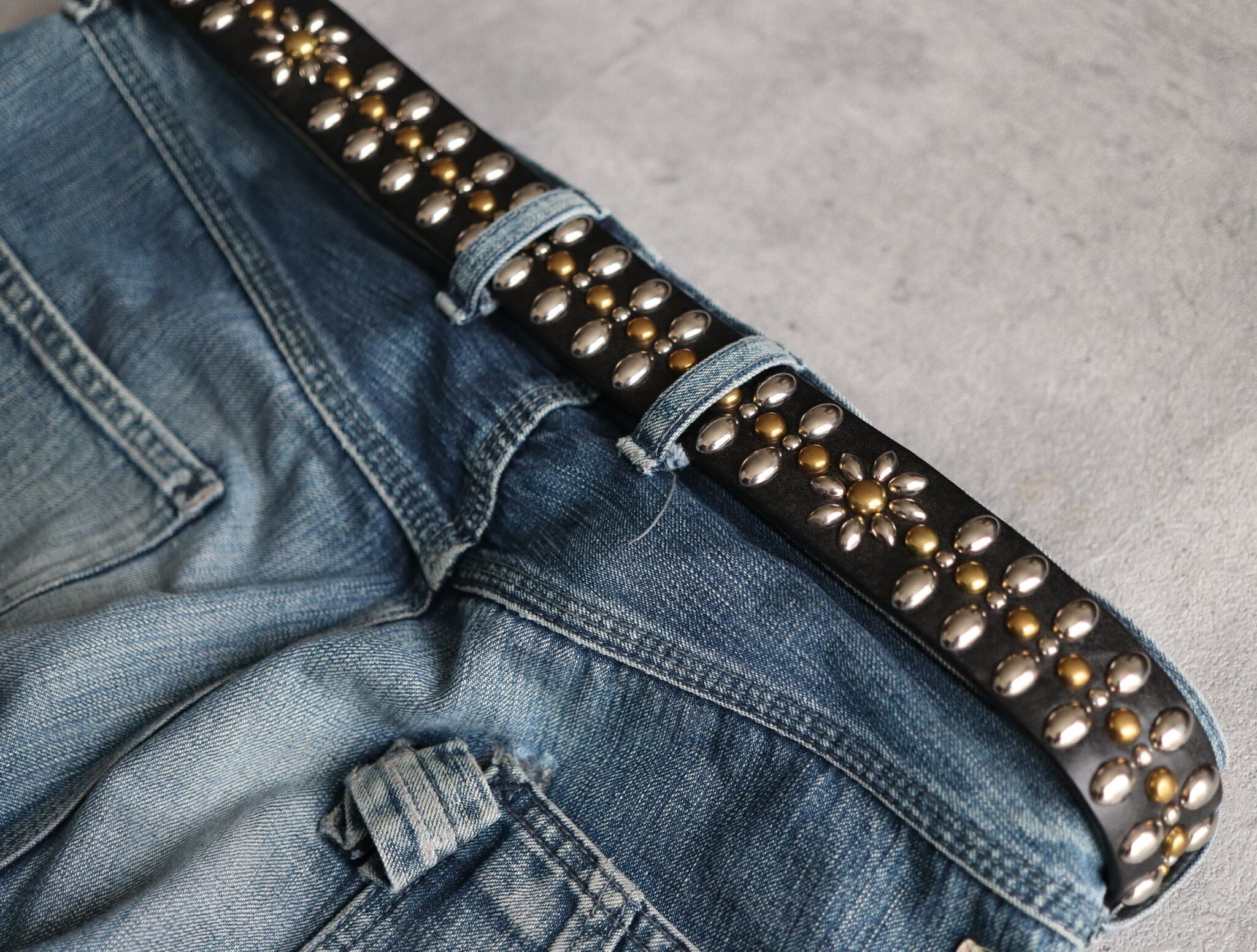 ヴィンテージのスタッズベルトをベースにpunkやRock、様々なジャンルのパターンを取り入れ、アート性を求めるよりもパンツにベルトを通した際の違和感のなさを追求し、スタッズの柄単体で見るとアクが強く見えますがいざ着けてみると意外と馴染む、そんなベルトを目指しました。